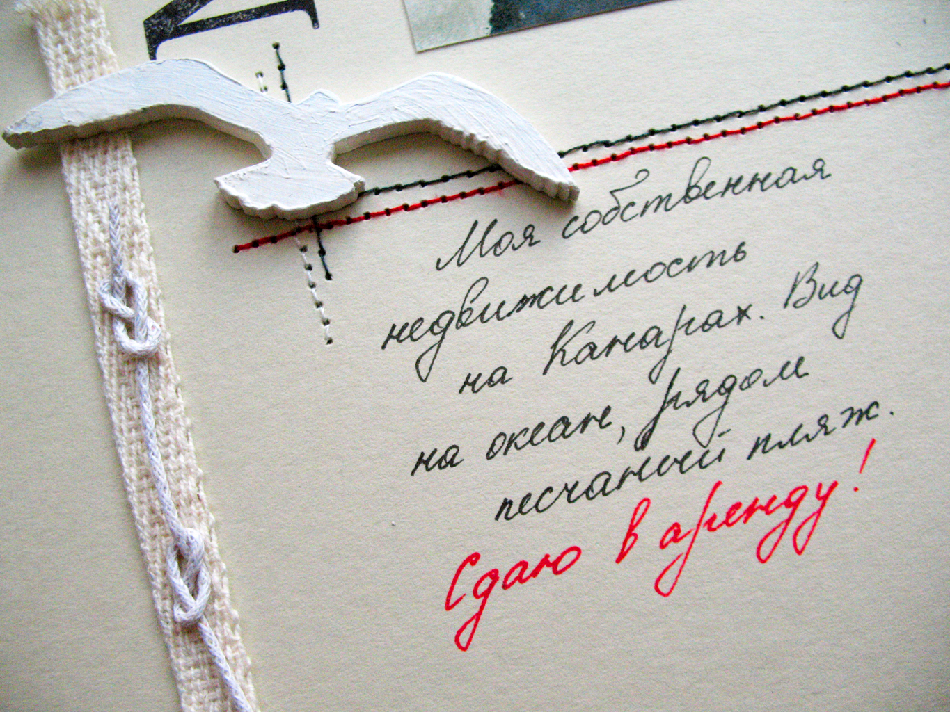 Ах да, еще местами затонирована чернилами, чтобы все это вместе сочеталось со страничкой. Эмбоссинг сделан черной пудрой и одной из дистресс-пудр (не помню точное название), которая по цвету и фактуре очень похожа на настоящий песок. Итак, сначала я сделала оттиск прозрачными чернилами, потом засыпала его дистресс-пудрой, но не весь, а только участки. Ссыпала пудру обратно в баночку, стряхнула все лишнее, и на оставшиеся пустые места добавила чёрную пудру.